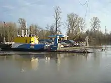 The Wheatland Ferry is a cable ferry that connects Marion County and Yamhill County across the Willamette River in the U.S. state of Oregon. The ferry travels approximately 580 feet (180 meters) across the river, depending on the height of the river, and is powered by two electric motors connected to an on-board diesel generator. The ferry is supported by two steel cables, one under water on the downriver side, and one overhead on the upriver side. The ferry also uses the overhead cable for steering.