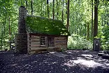 The park includes the Harper Family Log House, as part of its Brookside Nature Center.[26][27] This 1½ story log cabin, historically known as the Richard Thomas Harper House, was built in the 1870s, in Poolesville, Maryland, located in western Montgomery County.[26][27] In 1976, the Maryland-National Capital Park and Planning Commission (M–NCPPC) dismantled the house and reassembled it in Wheaton Regional Park, to serve as an exemplar of a pioneer cabin, for the United States Bicentennial.[26] Throughout the late 19th and first half of the 20th centuries, the log house was the home of an African-American landowning family. It consisted of one downstairs room and two upstairs rooms. It had a large stone fireplace with a brick stack. The parents in the family raised a total of 15 children in this three room house, although not all of the children lived there at the same time.[26]