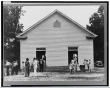 Depressio-era photographer Dorothea Lange photographed the church in early July 1939 as part of her project with the Farm Service Administration.[4] Before any photos were taken, Lange had to receive the permission of the older members of the church. Because of hesitation of several members she did not photograph inside the church. She photographed the church on two occasions: the first was on Wednesday, July 5, 1939; she photographed the ladies cleaning the church property. The second was on Sunday, July 9, 1939, where she photographed the congregation as they departed church services. The men departed from the left door and the women on the right door. Lange's work provided a glimpse of religious life in the south in the late 1930s.[5]