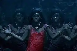 As the second verse begins, Rihanna is seen in an African hut lying on the floor, surrounded by female dancers. She performs on the floor, in one moment managing to put her leg over her head, before standing up and again, performing a dance routine. The performers are seen to make the shape of an eye, with Rihanna in the centre as the pupil. In this scene she wears a black lace ensemble with a new wild curly hairstyle. This is followed with the singer lying in a large birds' nest and then goes back to the singer with her previous wild hairstyle, performing a complex dance routine with female dancers, this time with fluorescent green effects. The penultimate scene shows Rihanna in a long dress which lights up neon red, while the singer has sequins across her face. She then appears to channel Hindu god Shiva as multiple arms surround her body. In the final scene, Rihanna and her male background dancers seen previously, slowly descend back underwater into the swamp; Rihanna's head completely submerges below the water.