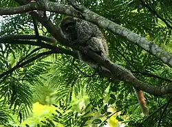Body weight ranges from around 800 to 1,200 grams (1.8 to 2.6 lb), with the female generally a little lighter.[7] It has the dental formula 2.1.3.32.1.3.3 × 2 = 36, meaning that on each side of the jaw it has two incisors, one canine tooth, three premolars, and three molar teeth.[8] The canine teeth are relatively short when compared with other New World monkeys.[9] In captivity, the white-eared titi has been known to live for over 25 years.[10]