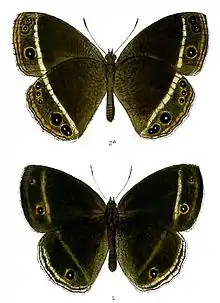 Upperside very dark Vandyke brown, the cilia conspicuously white, the transverse white discal band of the underside showing through on both forewing and hindwing, but very plainly on the latter. Forewing with a white-centred, fulvous-ringed, median, and a similar but much smaller subapical eyespot, the latter very often absent; broad but faint and ill-defined sub-terminal and terminal white lines. Hindwing: a subtornal ocellus (eyespot) similar to those on the forewing and much more conspicuous; subterminal and terminal whitish lines. Underside: ground colour similar; basal half of wings closely irrorated (sprinkled) with pale transverse stripe; a conspicuous white discal band, inwardly sharply defined, outwardly diffused, followed by series of ocelli similar to the ocelli on the upperside, a median and two subapical on the forewing, three subapical and three tornal on the hindwing: the number of these ocelli is variable, sometimes one or more additional ocelli are present, often one or more are lacking on the hindwing; finally, the subterminal and terminal white bands as on the upperside but better defined. Antenna, head, thorax and abdomen brown; antennae annulated (ringed) with white, ochraceous at apex. Male sex-mark in form 2.
