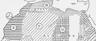 Pomponius Mela wrote, in Frank E. Romer's translation, that "On those shores washed by the Libyan Sea, however, are found the Libyan Aegyptians, the White Aethiopians, and, a populous and numerous nation, the Gaetuli. Then a region, uninhabitable in its entire length, covers a broad and vacant expanse."[4]