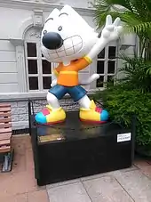 Q Boy is the main character of the White Cat Black Cat series. He is one of the 24 classic local comic characters selected by CreateHK in 2012.[1] The three-dimensional sculpture of Q Boy was displayed at Kowloon Park in Tsim Sha Tsui and Golden Bauhinia Square in Wan Chai.