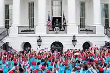 On September 16, it was reported that at least one unnamed staffer had tested positive.[39][40] After Trump's hospitalization, it was revealed that two members of the residence staff had tested positive that week.[41] On September 17, Trump held a rally at an airport in Mosinee, Wisconsin; Thousands attended, few masks were worn and social distancing was not observed.[42][43] The county experienced a surge in COVID-19.[36]