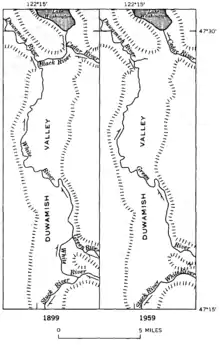 The White River valley was the scene of violent clashes between Native Americans and the militias of Washington Territory as well as the U.S. Army during the Puget Sound War of 1855-1856. Volunteer US troops were ambushed[9] while on their way to work on a construction project near a ferry across the river in the last altercation in the war.[10]