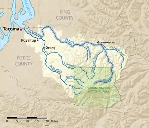 ![]() The White River is shown highlighted in the Puyallup River watershed | |