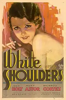White Shoulders is a lost[4] 1931 American pre-Code comedy-drama film directed by Melville W. Brown and starring Mary Astor and Jack Holt, with major supporting roles by Ricardo Cortez and Sidney Toler.[5] The film was produced and distributed by RKO Pictures. The screenplay by Jane Murfin and J. Walter Ruben was adapted from Rex Beach's short story, The Recoil.