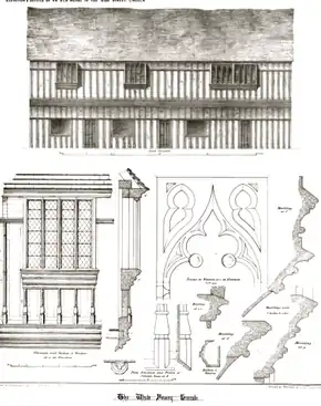 Surprisingly little is known about this building. The name Akrill refers to a baker who owned the property in the early part of the 19th century. Padley, who made scaled drawings of the buildings in 1851, said that traditionally it was thought to be part of the White or Carmelite Friary in Lincoln. Adjacent to it at the east end was a small stone building with a Norman arch.[1] As the Carmelite friary has now been shown by archaeological excavation to have been under St Mark's Station, on the opposite side of the High Street, it is unlikely that the building was associated with the friary. It has been alternatively suggested that the Whitefriars was the half-timbered vicarage of St Mary le Wigford church, but there is documentary evidence that in 1563 it was owned by Arthur Hall, an important Grantham merchant – this appears to be the same Arthur Hall who was the MP for Grantham. The building may have been a speculative commercial venture, attracting superior tenants who would sell from the ground floor chamber and live with their family on the first floor.[2] Restoration work was undertaken to the building in 1963.[3]