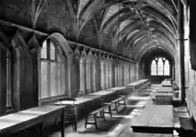 The remaining cloister walk (the eastern cloister range)[8] would have been one of four, which originally formed a continuous quadrangle.[19] The cloister which remains is relatively unchanged from how it would have been when it was constructed. The windows would originally have had no bars and looked out onto a garden or lawn.[19] Marks along one wall still remain where wooden benches and tables were affixed to it in the 19th century, when the building was a workhouse.[19]