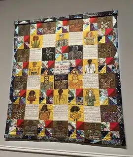 Who's Afraid of Aunt Jemima? is a quilt work made with acrylic paint and consists of 56 square panels, bordered by patterned fabric.[1] 28 panels contain paintings of people, 18 panels contain designs of patterned fabric, and 10 panels contain text, including the center panel which contains the title of the work.[2]