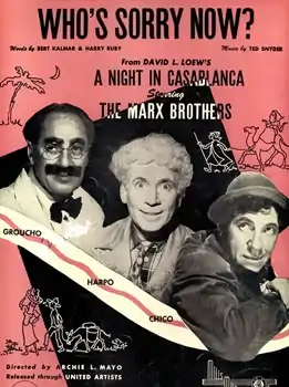 "Who's Sorry Now?" was also featured in the Marx Brothers film A Night in Casablanca (1946), directed by Archie Mayo and released by United Artists. It was also used in the 1950 film Three Little Words when it was sung by Gloria DeHaven.