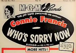 "Who's Sorry Now?" was recorded in 1957 by Connie Francis, and since then the song has become closely identified with her due to the immense popularity of her version which was her breakout hit. Since 1955, Francis had recorded 20 sides for MGM Records and only one ("The Majesty of Love", a duet with country singer Marvin Rainwater that eventually became a million-selling record) charted at all. Due to her near-complete failure as a recording artist, MGM informed her that her contract would end after one more disc. With her music career on the line, Francis's father suggested she record "Who's Sorry Now". He was convinced that it would have crossover appeal with both older listeners and teenagers if the song were given a modernized sound. Francis strongly objected to the idea on the grounds that selling the youth audience on an almost 35-year-old song was "ridiculous", but she finally agreed to it as a favor to her father.[7]