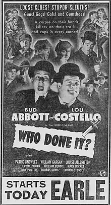 Who Done It? is a 1942 American comedy-mystery film directed by Erle C. Kenton and starring Bud Abbott and Lou Costello. It is noteworthy as their first feature that contains no musical numbers.