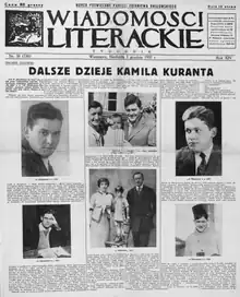 In 1946, Grydzewski resumed publication of his weekly monochrome broadsheet format on glossy paper, under the title Wiadomości.[4] The editors-in-chief were: Mieczysław Grydzewski, (officially until his death in 1970, in practice until 1966, when he was partially paralysed after a stroke), Michał Chmielowiec until 1974, and Stefania Kossowska until 1981, who also contributed sketches under the pseudonym, "Big Ben". No longer incommoded by war time restrictions it followed in the tradition of its pre-war precursor Wiadomości Literackie. Among its regular contributors were some old hands, Stanisław Baliński, Ferdynand Goetel, Marian Hemar, Jerzy Stempowski, Marian Kukiel, Jan Lechoń, Wacław Lednicki, Józef Łobodowski, Rafał Malczewski, Józef Mackiewicz, Zygmunt Nowakowski, Adam Pragier, Jan Rostworowski, Stanisław Stroński, Tymon Terlecki, Wiktor Weintraub, Ignacy Wieniewski, Kazimierz Wierzyński and Józef Wittlin.