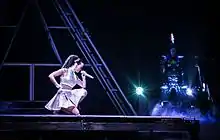 Perry debuted the song in an acrobatic fashion for the first time during the 2012 Billboard Music Awards on May 20, 2012, where she floated over the stage in a white ribbon swing keeping her suspended in the air while several background dancers performed with aerial silk.[51] On June 17, 2012, Perry performed "Wide Awake" at 2012 MuchMusic Video Awards, in which she stood on a raised platform, beginning the song as a cocoon and turned into a butterfly when she sang the last chorus.[52] On June 26, Perry performed "Wide Awake" on Jimmy Kimmel Live!. Instead of taking the Kimmel stage, she performed a medley of her songs including "Wide Awake" into her Katy Perry: Part of Me premiere in Hollywood Boulevard in Los Angeles. For President Barack Obama's 2012 presidential candidacy, Perry performed several of her songs dressed as a ballot, including "Teenage Dream", "Firework", and "Wide Awake".[53][54] Expressing solidarity for his campaign, the box next to Obama's name was shaded.[53][54]