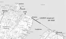 An employee at Kautokeino claimed that he had observed allied aircraft in the no-fly zone on the day of the accident, but investigations showed that he was not working in Finnmark in March. Investigations of the logs at Kautokeino and Sørreisa showed no entries regarding any NATO air traffic.[12] Captain Stein Aarbogh, working at Setermoen gunnery range, stated that on the day of the accident, two Harriers were expected, but showed up several hours late, at around five o'clock in the afternoon. Aarbogh was certain of whom was range officer at the gunnery range was on the day of the incident, but the commission could document that the person in question was working at Rygge Air Station on 11 March. Therefore, this incident could not have taken place on the day of the accident.[15]