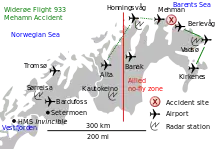Widerøe Flight 933, also known as the Mehamn Accident (Norwegian: Mehamn-ulykken), was the crash of a de Havilland Canada DHC-6 Twin Otter operated by Norwegian airline Widerøe. The Twin Otter crashed into the Barents Sea off Gamvik, Norway on 11 March 1982 at 13:27, killing all fifteen people on board. The results of the four official investigations were that the accident was caused by structural failure of the vertical stabilizer[note 1] during clear-air turbulence. A mechanical fault in the elevator control system caused the pilots to lose control of pitch; and either a series of stalls or a high-speed gust of wind caused the aircraft to lose altitude without the ability of the crew to counteract, resulting in the failure of the vertical stabilizer.