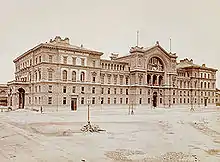 In the first planning phase around 1869, the project was the subject of numerous political and technical discussions. The focus was on the location between the regulated Danube river and Danube Canal, the elevation of the terrain and crossings for the local residents. Discussion points were how far the groundwater has to be taken into account, as the level of construction work has a significant impact on construction costs. Another point was the number and dimensions of the passageways underneath the station.[11] The structure was initially intended for the western (back) part of the Augarten, but this location would have hindered the connection between the Danube main stream and the city more than the finally selected location.[12] In mid-June 1869, a solution could be found next to the Taborstrasse, after complete reworking of the project.[13]