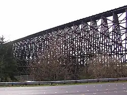 The trestle was originally completed in 1904[2] as part of the Northern Pacific Railway's Lake Washington Belt Line from Black River Junction (south of Seattle) to Woodinville. It was subsequently rebuilt four separate times, in 1913, 1924, 1934, and 1943, due to deterioration of the timber.[1] In 1973, a road, the Lake Hills Connector, was cut through the trestle, replacing a short section with concrete piers and steel deck girders.