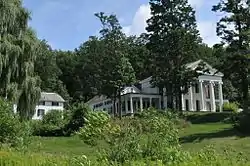 The Wilcox-Cutts House stands in a rural area of central-southern Orwell, on the east side of Vermont Route 22A just south of Sanford Brook. The house is set on a farm property in excess of 250 acres (100 ha) which the road roughly bisects. The house is set back about 200 feet (61 m) from the road on a terraced rise with woods behind. It is an L-shaped 2+1⁄2-story wood-frame structure, with a gabled roof and clapboarded exterior. The main portion of the house has a Greek temple front, with five Ionic columns supporting a pedimented gable. Greek Revival detailing extends to single-story flanking wings, with the northern one acting as a connector to the rear ell, which is the original 18th-century farmhouse. The interior of the main block has high quality Greek Revival woodwork and plaster detailing.[2]