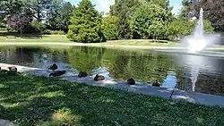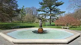 The park contains a number of monuments and memorials including the Wilcox Memorial Fountain (1930), designed by John Francis Paramino and given in honor of Harriet and Stephen Wilcox. One tree was planted in memory of boxing champion Rocky Marciano.