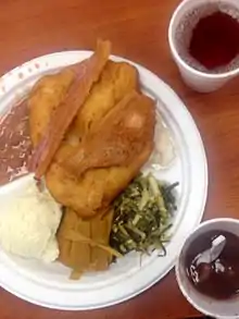 Pork, frybread, and corn bread are popular side dishes.[3] The typical dessert is grape dumplings, historically made from the juice of indigenous grapes, commonly called "possum grapes". Today the dumplings are often made from frozen grape juice and biscuit mix.[4]