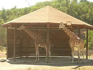 About 90 of the park's animals are in the Safari Village, which includes a petting zoo, train ride, restrooms, a restaurant, a playground, and gift shop.[12]