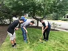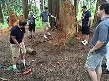 Play resumed for the Xtreme Croquet round at Microsoft headquarters, on the Redwest campus. The unusual terrain boasted a new obstacle to this year's round; “Death Tree.” Should a player's ball come into contact with Death Tree or its exposed roots, that player must return to the starting stake for their next turn; he or she does not lose any completed wickets. Overall, Death Tree was struck four times between the two Xtreme matches, garnering it for future Wile Cup inclusion.