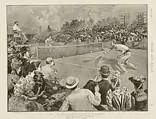 Wilfred, the better-known competitor, made his debut at Wimbledon in 1889 and he went on to win singles title three times in 1891, 1892 and 1895.[4] His 6–4, 1–6, 7–5, 6–0 win over Joshua Pim in 1891 at the age of 19 years and five months made him, until Boris Becker in 1985, the youngest men's singles champion at Wimbledon.[5] He was also runner-up in 1893, 1894 and 1896. With Herbert, he won four doubles championships at Wimbledon in 1891, 1894 – 1896.[4] The twins retired from competitive lawn tennis after the 1897 Wimbledon Championships to pursue their law careers but made a reappearance in the doubles event at Wimbledon in 1904 and 1905. In total he participated in eight Wimbledon singles tournaments and eleven doubles tournaments between 1889 and 1905.[6]