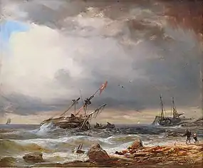 He had decided to specialize in marine painting, but he always put some landscaping in the foreground. Several study trips to the sea were taken for inspiration. In 1830, he travelled with his friend, Rudolf Jordan, to Rügen. He also travelled to Norway (1831), Holland (1834) and Normandy (1836). He wandered further afield, to England and Scotland, in 1842. Later he undertook study trips to coasts of France, Italy and Greece.