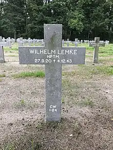 Lemke was killed in action in his Bf 109 G-6 (Werknummner 410558) on 4 December 1943 near Dodewaard, 12 kilometers (7.5 mi) northwest Nijmegen.[2] His mission was to lead an attack of 55 aircraft on a fighter intercept mission against USAAF fighters escorting Eighth Air Force bombers.[22] He was shot down by P-47 Thunderbolts of the 352nd Fighter Group.[23] His victors may have been Major John C. Meyer or Lieutenant Virgil Kersh Meroney.[24] Lemke was buried at the German war cemetery Ysselsteyn in the Netherlands (Block CW—Row 1—Grave 24).[9]