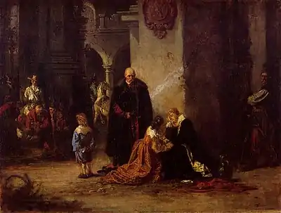 Leopolski's œuvre was dedicated to specifically Polish subjects from his early years. This manifested in his early paintings as "sentimental genre paintings based on motifs from Polish rural life."[2] His more mature work would include portraits of notable Polish intellligensia and history paintings of notable events from a Polish perspective. For the painters of Leopolski's generation, art was a patriotic mission, critical for the process of "shaping national historical awareness."[4]