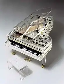 1952 Schimmel Pianos caused a sensation with the presentation of the first transparent acrylic glass piano.[9] The glass piano was improved 30 years later by Nicholas Schimmel. The piano soon became famous as it toured the world with the entertainer Udo Jürgens. Today the glass piano is highly demanded for TV shows, concerts tours and stages.
