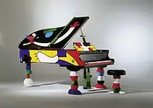 The grand piano designed by the artist Otmar Alt attracts attention with its colorful, flamboyant design.[24]