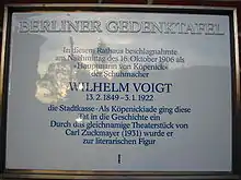 Friedrich Wilhelm Voigt (13 February 1849 – 3 January 1922) was a German impostor who, in 1906, masqueraded as a Prussian military officer, rounded up a number of soldiers under his "command", and "confiscated" more than 4,000 marks from a municipal treasury. Although he served two years in prison, he became a folk hero as "the Captain of Köpenick" (German: der Hauptmann von Köpenick [ˈhaʊptman fɔn ˈkøːpənɪk] ⓘ) and was pardoned by Kaiser Wilhelm II.