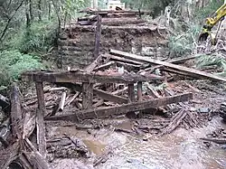 It was last used for heavy vehicular traffic in 1980 following the realignment of Marysville Road, and was left to decay until its demolishment in 2008. All timber traces of the bridge were destroyed in the 2009 Black Saturday fires. The handcrafted bluestone masonry wingwalls and abutments, especially shaped to receive timber struts, rate among the earliest of its kind surviving intact in Victoria.[4]