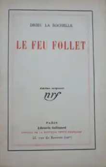Will O' the Wisp (French: Le feu follet) is a 1931 novel by the French writer Pierre Drieu La Rochelle. It has also been published in English as The Fire Within. It tells the story of a 30-year-old man who after military service, followed by a few years of cosmopolitan, decadent life, has become burned out, addicted to heroin and tired of living. The author's source of inspiration for the main character was the dadaist poet Jacques Rigaut (1898–1929).[1]