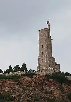 Will Rogers Shrine of the Sun, also known as Will Rogers Shrine, is a commemorative tower and chapel on Cheyenne Mountain in Colorado Springs, Colorado. It is named after Will Rogers, the American humorist, who died in a plane crash in Alaska in 1935 during construction of the shrine. It is also a tomb for the remains of Spencer Penrose – who built many of the city's prominent properties, including the neighboring Cheyenne Mountain Zoo and The Broadmoor resort – and his wife Julie Penrose. Completed by Penrose in 1937, the shrine is a 100 feet (30 m), five story observation tower that overlooks The Broadmoor, Colorado Springs, and Garden of the Gods.
