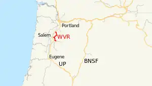 The Willamette Valley Railway (reporting marks WVR, WGR) is a short-line railroad that operates in the Willamette Valley of Oregon. It leased a line from Woodburn to Stayton from the Southern Pacific Transportation Company in February 1993, as well as a branch from Geer west to Salem (partly abandoned in 1995[1]),[2] and purchased the property in 1996.[3] The company also leased a line between Albany and Mill City in 1993, but transferred the lease to the Albany and Eastern Railroad in October 2000.[4][5]