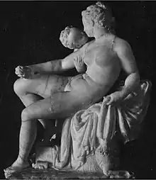 He was particularly known for his small-scale works, often executed in alabaster for which his native town Mechelen was famous.[3] His earliest known work is the Cypris and Eros (1561, private collection). This small-scale marble statue was made not long after his return from Italy and shows the influence of Michelangelo's allegorical statues on tombs in Florence as well as Titian's Danaë. At the same time the nude figure prefigures the voluptuous beauties of the Flemish painters Rubens and Jordaens. Ten years later van den Broecke made the terracotta Anatomical study (Kunsthistorisches Museum), an écorché of a standing man. He is leaning against a tree trunk from which hangs the man's skin. In his right hand he holds the instrument with which he was skinned, a knife without a blade. In his left hand he holds part of his skin. The figure represents possibly Saint Bartholomew. An écorché such as this work was unprecedented in Flemish sculpture of the 16th century.[7] A similar figure executed in bronze has been attributed to van den Broecke (Christie's New York auction of 29 January 2014).[14]