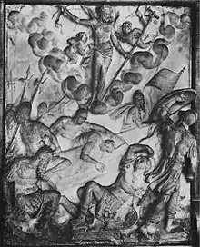 He made various reliefs of Calvaries (depictions of the Crucifixion of Christ) in alabaster. These were likely destined for private devotion in residential homes (Maximilian Museum, Augsburg and Louvre Museum, Paris).[15] His oldest alabaster relief is the Crucifixion of Christ, dated 1560 (Maximilian Museum in Augsburg).[7] It was part of a retable of van den Broecke that was originally commissioned in 1560 by Bartholomeus May and his wife Sibilla Rembold for the Dominican church in Augsburg.[13] The other parts of the retable include the Last Supper, the Sacrifice of Abraham, the Sacrifice of Melchizedek and the Resurrection of Christ (all in the Maximilian Museum in Augsburg). The Maximilian Museum holds another alabaster relief of the Crucifixion of Christ, signed and dated 1562, which was likely made for a private residence.[7] It has its counterpart in a Crucifixion in the Louvre.[13][15]