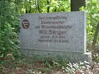 Willi Sänger resistance to National Socialism is memorialized in the Socialist Central Cemetery Friedrichsfelde in Berlin's Lichtenberg district.