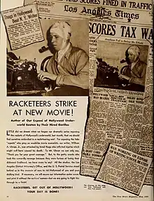 Ulman made national headlines in 1935 when an exposé he'd been writing about shady services exploiting novice screenwriters got him a visit and a thorough beating from a racketeer's enforcers.[5] In 1936 Ulman earned a credit for the Republic Pictures melodrama Down Under the Sea.[6] In the mid-1930s Ulman wrote a number of celebrity profiles for film magazines, reporting on Bing Crosby's relationship with his mother,[7] how Myrna Loy and William Powell played a married couple so convincingly in The Thin Man series,[8] and that Gary Cooper preferred action plots to performing love stories.[9] After doing a 1936 profile for Movie Classic magazine on Errol Flynn,[10] during which the two apparently hit it off, the pair formed a production partnership.[11] Their main collaboration was on a script called The White Rajah, about Sir James Brooke, Rajah of Sarawak. The film was meant to be a star vehicle for Flynn but was never produced, although it remained in development for as many as 30 years.[12] Flynn and Ulman remained in touch until at least 1940 when Flynn reportedly told Ulman (for use in print) that he had traveled to South America and seen "fifth columnists" at work there.[13] The 1939 Wallace Beery film Sergeant Madden, directed by Josef von Sternberg, was based on an Ulman story called "A Gun in His Hand."[14] In 1939 he also sold a script called Gold Star Mothers to Producers' Picture Corporation.[15] In 1940 Paramount was supposed to be producing a script he has co-written, called Two Bad Angels.[16] In 1943 he was credited with the story for the gangster film Behind Prison Walls.[17]