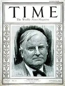 In the 1928 presidential election, he condemned the Democratic nominee Al Smith as the candidate of "the saloon, prostitution, and gambling" for Smith's opposition to Prohibition.[12] In the 1930s he was an early supporter of the Republican presidential nominees, Alf Landon of Kansas in 1936, and Wendell Willkie in 1940. However, White was on the liberal wing of the Republican Party and wrote many editorials praising the New Deal of President Franklin D. Roosevelt.
