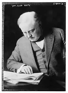 In his novels and short stories, White developed his idea of the small town as a metaphor for understanding social change and for preaching the necessity of community.[6] While he expressed his views in terms of the small town, he tailored his rhetoric to the needs and values of emerging urban America. The cynicism of the post-World War I world stilled his imaginary literature, but for the remainder of his life he continued to propagate his vision of small-town community. He opposed chain stores and mail order firms as a threat to the business owner on Main Street. The Great Depression shook his faith in a cooperative, selfless, middle-class America. Like most old Progressives his attitude toward the New Deal was ambivalent: President Franklin D. Roosevelt cared for the country and was personally attractive, but White considered his solutions haphazard. White saw the country uniting behind old ideals by 1940, in the face of foreign threats.[7]