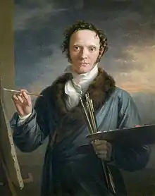 Hobday was born in Birmingham, the eldest of 4 sons of Samuel Hobday (1746–1816), a rich Birmingham spoon manufacturer.[1] Showing a capacity for drawing, he was sent to London when still a boy, and articled to an engraver named William Barney, with whom he remained for six years, studying at the same time in the Royal Academy schools. He then established himself in Charles Street, near the Middlesex Hospital, as a painter of miniatures and watercolour portraits, and commenced to exhibit at the Royal Academy in 1794. He was fortunate in soon securing a fashionable clientele, married Elizabeth Ivory (from Worcester), and in 1800 moved to Holles Street, Cavendish Square, where, supported largely by his father, he lived for a short time in a recklessly expensive manner.