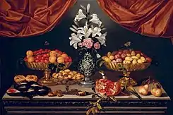 In Spanish Still Life from Velázquez to Goya, Jordan coined the term "Pseudo-Hiepes" to describe a then-unknown artist, and attributed around 40 paintings to them due to similarities in their style to the works of Tomás Hiepes.[67] Against a contemporary opinion that the painter was based in Italy, Jordan argued that Pseudo-Hiepes most likely belonged to Aragon, owing to the antiquated themes of paintings from that region.[68] The assessments were validated when Pewter Dish with Melons, Grapes, Apricots and Plums (1675–1700), a signed painting by Bernardo Polo of Aragon, was discovered in 2009. Jordan assessed the painting to be nearly identical in its facture and composition to the works of Pseudo-Hiepes, which also frequently contained elements unique to Pewter Dish with Melons, Grapes, Apricots and Plums. He concluded that Pseudo-Hiepes was Polo.[69]