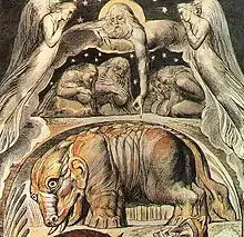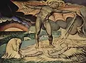 Blake used symbols extensively in the illustrations; most notable is the use of right and left limbs in the figures.[15][16] The right limb represents the spiritual and the good; the left, the material and evil. In plate six, Satan smites Job with boils using his left hand, and in plate 15 God indicates Behemoth and Leviathan with his left hand. Contrarily, God banishes Satan with his right hand in plate sixteen and speaks to Job from the whirlwind in plate fourteen with his right foot extended forward. Some scholars, however, have asserted that this systematic interpretation fails to account for inconsistencies in such symbolism and is excessively subjective.[17]