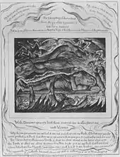 The Book of Job was an important influence upon Blake's writings and art;[11] Blake apparently identified with Job, as he spent his lifetime unrecognized and impoverished. Harold Bloom has interpreted Blake's most famous lyric, The Tyger, as a revision of God's rhetorical questions in the Book of Job concerning Behemoth and Leviathan.[12] Blake also depicted the story of Job throughout his career as an artist. The song of Enion in Night the Second of The Four Zoas also demonstrates that Blake identified with Job.[13][14]